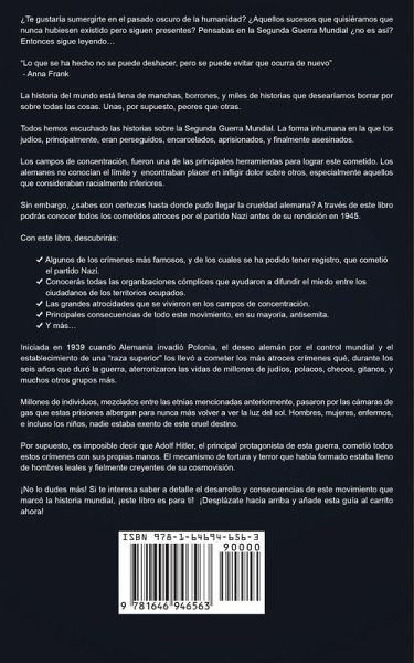 ¿Te gustaría sumergirte en el pasado oscuro de la humanidad? ¿Aquellos sucesos que quisiéramos que nunca hubiesen existido pero siguen presentes? Pensabas en la Segunda Guerra Mundial ¿no es así? Entonces sigue leyendo... "Lo que se ha hecho no se puede deshacer, pero se puede evitar que ocurra de nuevo" - Anna Frank La historia del mundo está llena de manchas, borrones, y miles de historias que desearíamos borrar por sobre todas las cosas. Unas, por supuesto, peores que otras. Todos hemos escuchado las historias sobre la Segunda Guerra Mundial. La forma inhumana en la que los judíos, principalmente, eran perseguidos, encarcelados, aprisionados, y finalmente asesinados. Los campos de concentración, fueron una de las principales herramientas para lograr este cometido. Los alemanes no conocían el límite y encontraban placer en infligir dolor sobre otros, especialmente aquellos que consideraban racialmente inferiores. Sin embargo, ¿sabes con certezas hasta donde pudo llegar la crueldad alemana? A través de este libro podrás conocer todos los cometidos atroces por el partido Nazi antes de su rendición en 1945. Con este libro, descubrirás: * Algunos de los crímenes más famosos, y de los cuales se ha podido tener registro, que cometió el partido Nazi. * Conocerás todas las organizaciones cómplices que ayudaron a difundir el miedo entre los ciudadanos de los territorios ocupados. * Las grandes atrocidades que se vivieron en los campos de concentración. * Y más... Millones de individuos, mezclados entre las etnias mencionadas anteriormente, pasaron por las cámaras de gas que estas prisiones albergan para nunca más volver a ver la luz del sol. Hombres, mujeres, enfermos, e incluso los niños, nadie estaba exento de este cruel destino. Por supuesto, es imposible decir que Adolf Hitler, el principal protagonista de esta guerra, cometió todos estos crímenes con sus propias manos. El mecanismo de tortura y terror que había formado estaba lleno de hombres leales y fielmente creyentes de su cosmovisión. ¡No lo dudes más! Si te interesa saber a detalle el desarrollo y consecuencias de este movimiento que marcó la historia mundial, ¡este libro es para ti! ¡Desplázate hacia arriba y añade esta guía al carrito ahora!