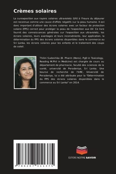 La surexposition aux rayons solaires ultraviolets (UV) à l'heure du déjeuner est reconnue comme une cause d'effets négatifs sur la peau humaine. Il est donc important d'utiliser des écrans solaires avec un facteur de protection solaire (FPS) correct pour protéger la peau de l'exposition aux UV. Ce livre fournit des connaissances générales sur l'exposition aux ultraviolets, les écrans solaires, leurs avantages et leurs inconvénients, leur application, la détermination du FPS des écrans solaires disponibles dans le commerce au Sri Lanka, les écrans solaires pour les enfants et le traitement des coups de soleil.