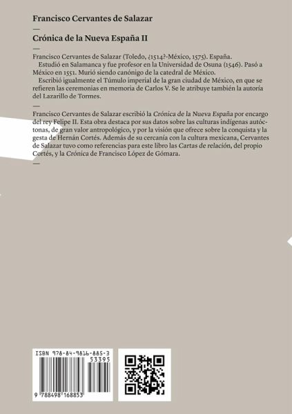 Francisco Cervantes de Salazar escribió la Crónica de la Nueva España alrededor de 1560, por encargo del rey Felipe II. Apareció en forma de libro impreso en la tardía fecha de 1914. Esta obra destaca por sus datos sobre las culturas indígenas autóctonas, de gran valor antropológico, y por la visión que ofrece sobre la conquista y la gesta de Hernán Cortés. Además de su cercanía con la cultura mexicana, Cervantes de Salazar tuvo como referencias para este libro las Cartas de relación, del propio Cortés, y la Historia general de las Indias y conquista de México, de Francisco López de Gómara. Linkgua ediciones ha editado la obra de Cervantes de Salazar en dos volúmenes. El primer volumen comprende del libro I al libro III. En este segundo volumen el lector encontrará los libros IV al VI. El libro cuarto -es el más extenso de todos- se compone de 134 capítulos que aparecen sin numerar. La descripción detallada que hace de la ciudad de México es un testimonio inapreciable de la urbe colonial. El libro V consta de 197 capítulos, de los que solo están numerados los 66 primeros. Finalmente, el Libro VI está incompleto. Se compone de 33 capítulos, si bien del último solo aparece el título.