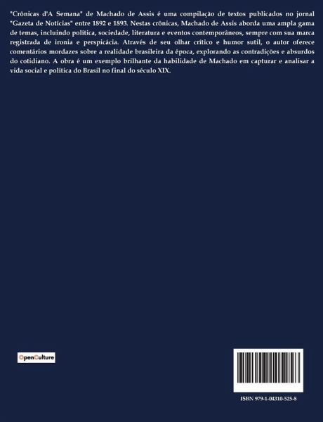 "Crônicas d'A Semana" de Machado de Assis é uma compilação de textos publicados no jornal "Gazeta de Notícias" entre 1892 e 1893. Nestas crônicas, Machado de Assis aborda uma ampla gama de temas, incluindo política, sociedade, literatura e eventos contemporâneos, sempre com sua marca registrada de ironia e perspicácia. Através de seu olhar crítico e humor sutil, o autor oferece comentários mordazes sobre a realidade brasileira da época, explorando as contradições e absurdos do cotidiano. A obra é um exemplo brilhante da habilidade de Machado em capturar e analisar a vida social e política do Brasil no final do século XIX.