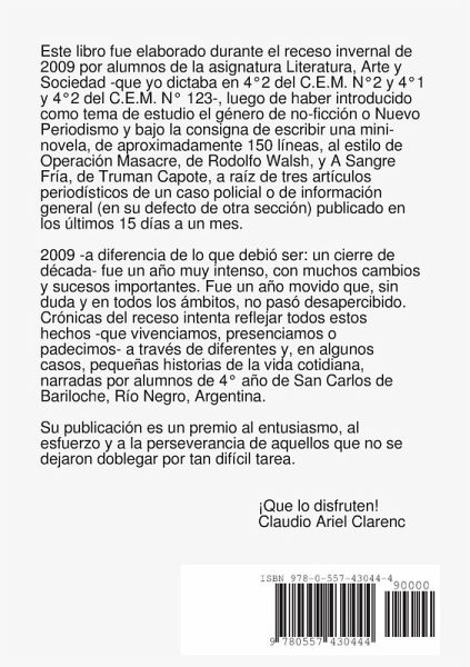 2009 -a diferencia de lo que debió ser: un cierre de década- fue un año muy intenso, con muchos cambios y sucesos importantes. Fue un año movido que, sin duda y en todos los ámbitos, no pasó desapercibido. Crónicas del receso intenta reflejar todos estos hechos -que vivenciamos, presenciamos o padecimos- a través de diferentes y, en algunos casos, pequeñas historias, narradas por alumnos de 4° año de San Carlos de Bariloche, Río Negro, Argentina. Su publicación es un premio al entusiasmo, al esfuerzo y a la perseverancia de aquellos que no se dejaron doblegar por tan difícil tarea.