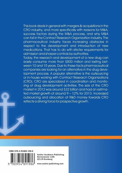 This book deals in general with mergers and acquisitions in the CRO industry, and more specifically with reasons for MandA, success factors during the MandA process, and why MandA can fail in the Contract Research Organization industry. The pharmaceutical industry faces increasing obstacles in respect to the development and introduction of new medications. That has to do with stricter requirements for admission and sharper controls by authorities. Today, the research and development of a new drug can easily consume more than $800 million and lasting between 10 and 15 years. Due to these facts pharmaceutical companies are looking for an alternative in the drug development process. A popular alternative is the outsourcing or in-house working with Contract Research Organizations (CRO). CRO are specialized in coordination and monitoring of drug development activities. The size of the CRO market in 2012 was around $32 billion and had an estimated market growth of around 9 12% for 2013. Increased outsourcing and allocation of RandD money towards CRO reflects a driving force for prospective growth. Contract Research Organizations consider mergers and acquisitions as a vital solution to achieve their objectives.
