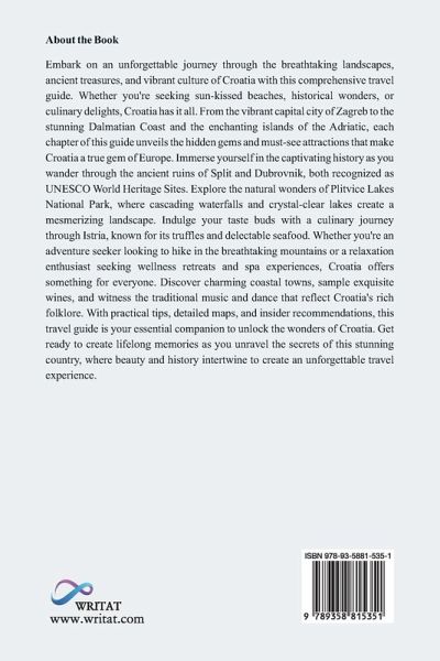 Embark on an unforgettable journey through the breathtaking landscapes, ancient treasures, and vibrant culture of Croatia with this comprehensive travel guide. Whether you're seeking sun-kissed beaches, historical wonders, or culinary delights, Croatia has it all. From the vibrant capital city of Zagreb to the stunning Dalmatian Coast and the enchanting islands of the Adriatic, each chapter of this guide unveils the hidden gems and must-see attractions that make Croatia a true gem of Europe. Immerse yourself in the captivating history as you wander through the ancient ruins of Split and Dubrovnik, both recognized as UNESCO World Heritage Sites. Explore the natural wonders of Plitvice Lakes National Park, where cascading waterfalls and crystal-clear lakes create a mesmerizing landscape. Indulge your taste buds with a culinary journey through Istria, known for its truffles and delectable seafood. Whether you're an adventure seeker looking to hike in the breathtaking mountains or a relaxation enthusiast seeking wellness retreats and spa experiences, Croatia offers something for everyone. Discover charming coastal towns, sample exquisite wines, and witness the traditional music and dance that reflect Croatia's rich folklore. With practical tips, detailed maps, and insider recommendations, this travel guide is your essential companion to unlock the wonders of Croatia. Get ready to create lifelong memories as you unravel the secrets of this stunning country, where beauty and history intertwine to create an unforgettable travel experience.