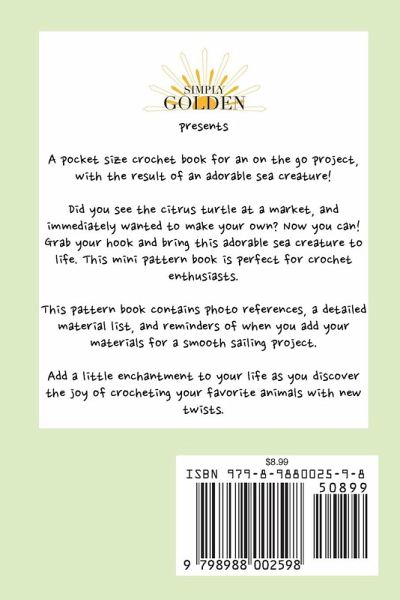 A pocket size crochet book for an on the go project, with the result of an adorable sea creature! Did you see the citrus turtle at a market, and immediately wanted to make your own? Now you can! Grab your hook and bring this adorable sea creature to life. This mini pattern book is perfect for crochet enthusiasts. Add a little enchantment to your life as you discover the joy of crocheting your favorite animals with new twists.