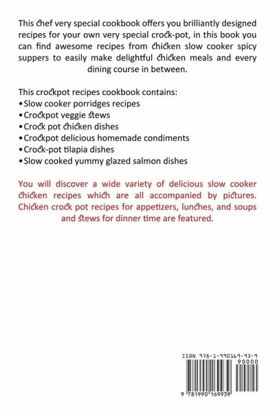 This chef very special cookbook offers you brilliantly designed recipes for your own very special crock-pot, in this book you can find awesome recipes from chicken slow cooker spicy suppers to easily make delightful chicken meals and every dining course in between. This crockpot recipes cookbook contains: ¿ Slow cooker porridges recipes ¿ Crockpot veggie stews ¿ Crock pot chicken dishes ¿ Crockpot delicious homemade condiments ¿ Crock-pot tilapia dishes ¿ Slow cooked yummy glazed salmon dishes You will discover a wide variety of delicious slow cooker chicken recipes which are all accompanied by pictures. Chicken crock pot recipes for appetizers, lunches, and soups and stews for dinner time are featured.