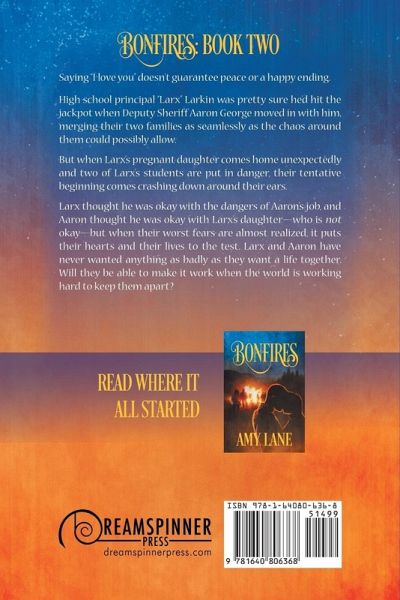 Bonfires: Book Two Saying "I love you" doesn't guarantee peace or a happy ending. High school principal "Larx" Larkin was pretty sure he'd hit the jackpot when Deputy Sheriff Aaron George moved in with him, merging their two families as seamlessly as the chaos around them could possibly allow. But when Larx's pregnant daughter comes home unexpectedly and two of Larx's students are put in danger, their tentative beginning comes crashing down around their ears. Larx thought he was okay with the dangers of Aaron's job, and Aaron thought he was okay with Larx's daughter-who is not okay-but when their worst fears are almost realized, it puts their hearts and their lives to the test. Larx and Aaron have never wanted anything as badly as they want a life together. Will they be able to make it work when the world is working hard to keep them apart?