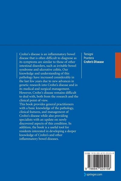 This book provides general practitioners with a basic knowledge of the disease, offering in the same time an update on new facts about Crohn's disease to specialists. It can also be useful for residents willing to develop a deeper knowledge of inflammatory bowel diseases.