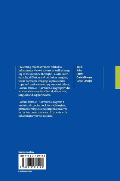 1. Etiology and clinical features of Crohn's Disease.- 2. Pathological consideration in Crohn's Disease.- 3. The Role of endoscopy in the diagnosis and management of Crohn's Disease.- 4. Capsule Endoscopy in the Evaluation of Crohn's disease.- 5.Role of CTE/Enteroclysis in Crohn's Disease.- 6. Ultrasonography in Crohn's disease.- 7. CT and Magnetic Resonance enterography in Crohn's disease.- 8. MR enteroclysis in Crohn's disease.- 9. Radiological Assessment of Crohn's Disease - Current status and recent advances.- 10. Paediatric Crohn's disease.- 11. Surgical management of Crohn's disease.- 12. Overview of Medical management of Crohn's disease.