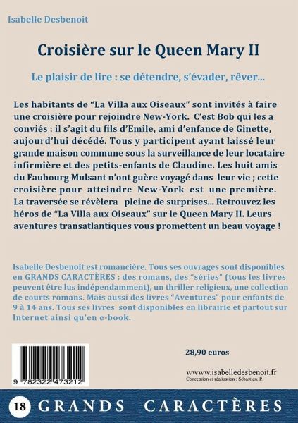 Les habitants de "La Villa aux Oiseaux"* sont invités à faire une croisière pour rejoindre New-York. C'est Bod qui les a conviées : il s'agit du fils d'Émile, ami d'enfance de Ginette, aujourd'hui décédé. Tous y participent ayant laissé leur grande maison commune sous la surveillance de leur locataire infirmières et des petits-enfants de Claudine. Les huit amis du Faubourg Mulsant n'ont guère voyagé dans leur vie ; Cette croisière pour atteindre New-York est une première. La traversée se révèlera pleine de surprises... Retrouvez les héros de "La Villa aux Oiseaux" sur le Queen Mary II. Leurs aventures transatlantiques vous promettent un beau voyage !