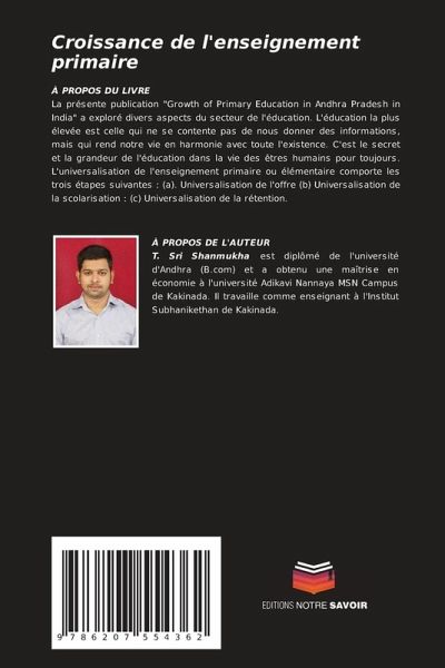 À PROPOS DU LIVRELa présente publication "Growth of Primary Education in Andhra Pradesh in India" a exploré divers aspects du secteur de l'éducation. L'éducation la plus élevée est celle qui ne se contente pas de nous donner des informations, mais qui rend notre vie en harmonie avec toute l'existence. C'est le secret et la grandeur de l'éducation dans la vie des êtres humains pour toujours. L'universalisation de l'enseignement primaire ou élémentaire comporte les trois étapes suivantes : (a). Universalisation de l'offre (b) Universalisation de la scolarisation : (c) Universalisation de la rétention.