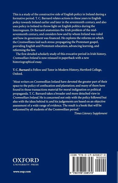 This is a study of the constructive side of English policy in Ireland during a formative period. T. C. Barnard relates actions in these years to English policy towards Ireland earlier and later in the seventeenth century, and also uses policy in Ireland to throw light on English politics during the Interregnum. Dr Barnard anatomizes the Irish problem of the mid-seventeenth century, and considers how and by whom Ireland was ruled and how its government was financed. He explores the reforms on which the Cromwellians laid such stress: propagating the Protestant gospel, providing English and Protestant education, advancing learning, and reforming the law. The first detailed scholarly study of this evocative period in Irish history, Cromwellian Ireland is now reissued in paperback with a new historiographical essay.