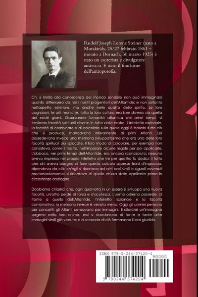 Chi si limita alla conoscenza del mondo sensibile non può immaginarsi quanto differissero da noi i nostri progenitori dell'Atlantide; e non soltanto nell'aspetto esteriore, ma anche nelle qualità dello spirito. Le loro cognizioni, le arti tecniche, tutta la loro cultura era ben diversa da quella dei nostri giorni. Osservando l'umanità atlantica dei primi tempi, vi troviamo facoltà spirituali diverse in tutto dalle nostre. L'intelletto razionale, la facoltà di combinare e di calcolare sulla quale oggi è basato tutto ciò che si produce, mancavano interamente ai primi Atlanti. Dobbiamo chiarirci che, ogni qualvolta in un essere si sviluppa una nuova facoltà, un'altra perde di forza e d'acutezza. L'uomo odierno possiede, di fronte a quello dell'Atlantide, l'intelletto razionale e la facoltà combinativa; la memoria invece è venuta meno.