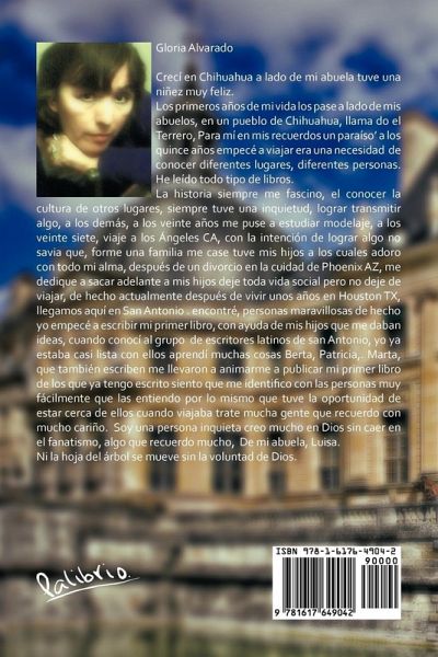 Gloria Alvarado Crecí en Chihuahua a lado de mi abuela tuve una niñez muy feliz. Los primeros años de mi vida los pase a lado de mis abuelos, en un pueblo de Chihuahua, llama do el Terrero, Para mí en mis recuerdos un paraíso' a los quince años empecé a viajar era una necesidad de conocer diferentes lugares, diferentes personas. He leído todo tipo de libros. La historia siempre me fascino, el conocer la cultura de otros lugares, siempre tuve una inquietud, lograr transmitir algo, a los demás, a los veinte años me puse a estudiar modelaje, a los veinte siete, viaje a los Ángeles CA, con la intención de lograr algo no savia que, forme una familia me case tuve mis hijos a los cuales adoro con todo mi alma, después de un divorcio en la cuidad de Phoenix AZ, me dedique a sacar adelante a mis hijos deje toda vida social pero no deje de viajar, de hecho actualmente después de vivir unos años en Houston TX, llegamos aquí en San Antonio . encontré, personas maravillosas de hecho yo empecé a escribir mi primer libro, con ayuda de mis hijos que me daban ideas, cuando conocí al grupo de escritores latinos de san Antonio, yo ya estaba casi lista con ellos aprendí muchas cosas Berta, Patricia,. Marta, que también escriben me llevaron a animarme a publicar mi primer libro de los que ya tengo escrito siento que me identifico con las personas muy fácilmente que las entiendo por lo mismo que tuve la oportunidad de estar cerca de ellos cuando viajaba trate mucha gente que recuerdo con mucho cariño. Soy una persona inquieta creo mucho en Dios sin caer en el fanatismo, algo que recuerdo mucho, De mi abuela, Luisa. Ni la hoja del árbol se mueve sin la voluntad de Dios.