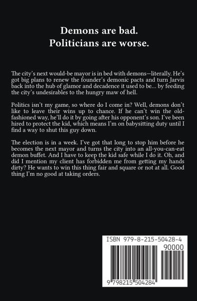 Demons are bad. Politicians are worse. The city's next would-be mayor is in bed with demons-literally. He's got big plans to renew the founder's demonic pacts and turn Jarvis back into the hub of glamor and decadence it used to be… by feeding the city's undesirables to the hungry maw of hell. Politics isn't my game, so where do I come in? Well, demons don't like to leave their wins up to chance. If he can't win the old-fashioned way, he'll do it by going after his opponent's son. I've been hired to protect the kid, which means I'm on babysitting duty until I find a way to shut this guy down. The election is in a week. I've got that long to stop him before he becomes the next mayor and turns the city into an all-you-can-eat demon buffet. And I have to keep the kid safe while I do it. Oh, and did I mention my client has forbidden me from getting my hands dirty? He wants to win this thing fair and square or not at all. Good thing I'm no good at taking orders.