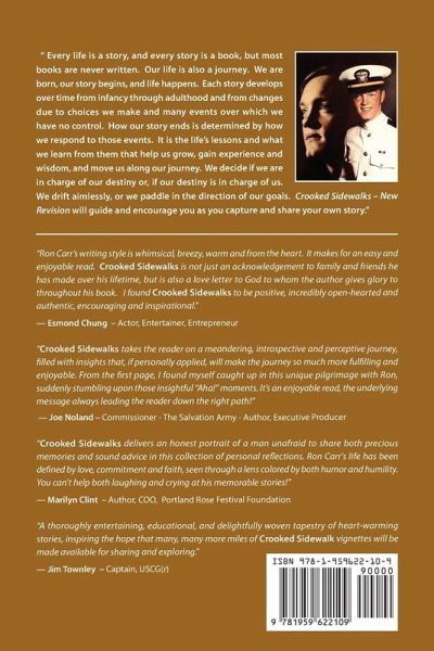 Every life is a story, every story is a book, but most books are never written. We are born, our story begins, life happens and our journey begins. Each story develops over time from infancy through adulthood and changes due to choices we make, and many times by events over which we have no control. Our journey takes us in one direction based on decisions we make, or in another direction based on decisions we don't make. And, as we learn over time, not making a decision is a decision. As we have our successes and failures, we also learn that failure is not terminal, and all we have to do to succeed is to keep getting up and trying again. How our story moves toward the next challenge or adventure, is determined by how we react to each event and propelled by our next step forward. It is the life's lessons and what we learn from them that help us grow, gain experience and wisdom, and move us along our journey. We decide if we are in charge of our destiny or if destiny is in charge of us. We drift aimlessly or we paddle in the direction of our goals. Crooked Sidewalks will guide you as you navigate your journey and share your own story.
