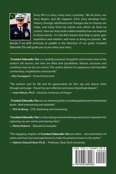 Welcome to Crooked Sidewalks Too. I purposely titled it this way, and not Crooked Sidewalks Two, because it is a follow-up to my first book, Crooked Sidewalks. I also see it more as a 'Crooked Sidewalks "Also', or a continuation with more stories with the same format and purpose to share lessons learned. I should state right up front that it is my personal belief that each and every one of us is put here on this earth for a purpose. I may not know what that purpose is, but at some time in my life, I may figure it out. There is a beginning, which starts even before we are born, and there is an end on the day we pass away. Everything that happens in between is "the story" of that life. In Crooked Sidewalks, and now Crooked Sidewalks Too, I share a very important principle of life, which I believe relates to how we look at life. I also believe, as I have heard on many occasions, "our life is God's gift to us, and what we do with that life is our gift back to God." I believe it. So, life happens! I believe every life is a story, and every story is a book, but not all books are written. The book is made up of chapters, and unfolds over time. Each chapter represents a period of time, a certain event, a personal relationship or something that defines or leads to what happens next. It can even change the direction of our journey. Some chapters may be short, but others may be long. Some are exciting and some are seriously boring. These chapters can be filled with joy and happiness and some may be filled with sorrow, pain and despair. Some are good and some are bad, or somewhere in between. Some are magical and some are tragedies. From the time of our birth, and even before, we are impacted by our surroundings, our environment, relations or interactions with those we come in contact with. Some circumstances we have control over, while there are many others we have no control over. As I've explained on many occasions, we are being carried downstream in a rushing river with life happening around every bend. It can be extremely exciting or it can be extremely terrifying. Regardless, it is life and the story of our journey. Since every life matters, a book would do so much to help us learn about our family, our history and our efforts to make the world a better place. We can learn from our failures and successes and share with others, while also learning from others who share their story with us. It may also help us when we contemplate questions like, "Who am I" or, "Why do I exist" or, in the grand scheme of things, "What is my purpose here on earth?" Lord knows, I don't have all the answers, but I have learned a few things along the way. My personal stories are represented by the chapters of this book. My story is no more special or less special than anyone else's. What does make it special to me is that it is mine. They tell me that with age, one gains wisdom. I hope with each lesson learned, I can offer you some insights that will encourage you on your own journey in understanding and in writing the various chapters of your own book. As I have journeyed through my life, I've had my ups and downs, my wins and my losses, and even a few memorable and worthy achievements. Realistically, though, my life is not that so different from a lot of people and, when all is said and done and with all that has happened, I can rejoice in the fact that I have yet another day to live and another chapter to write. Apparently, God isn't done with me yet. So, I will celebrate that fact and continue to enjoy my journey as I keep moving forward.