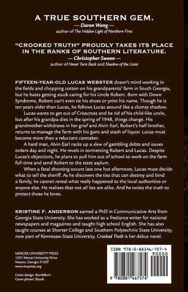 Fifteen-year-old Lucas Webster doesn't mind working in the fields and chopping cotton on his grandparents' farm in South Georgia, but he hates getting stuck caring for his Uncle Robert. Born with Down Syndrome, Robert can't even tie his shoes or print his name. Though he is ten years older than Lucas, he follows Lucas around like a clumsy shadow. Lucas wants to get out of Crisscross and be rid of his child-like uncle, but after his grandpa dies in the spring of 1948, things change. His grandmother withdraws in her grief and Alvin Earl, Robert's half-brother, returns to manage the farm with his guns and stash of liquor. Lucas must become more than a reluctant caretaker. A hard man, Alvin Earl racks up a slew of gambling debts and issues orders day and night. He revels in tormenting Robert and Lucas. Despite Lucas's objections, he plans to pull him out of school to work on the farm full-time and send Robert to the state asylum. When a fatal shooting occurs late one hot afternoon, Lucas must decide what to tell the sheriff. As he discovers the ties that can destroy and bind a family, he cannot reveal what really happened to the local authorities or anyone else. He realizes that not all lies are alike. And he twists the truth to protect those he loves.