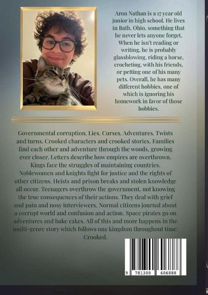 Crooked: A Complete History of a Nation Once Known as Ivara is a book about a single nation by the name of Ivara. It follows the story of this nation from the beginning of time all the way into the end of time. It is broken up into several sections, by genre. Each section has different characters and formats and dynamics. First, there is Francesco and his gang of friends, on a quest to stop a curse from ravaging their homeland. It then transitions into a collection of letters about the overthrowing of an evil emperor, but I won't spoil too much. Then, there is Cameron, a king. He and his girlfriend must confront the same curse and make a world altering decision about what to do. After Cameron makes his big decision, the book falls into a historical fiction world, where Lady Mary and her friends must rescue Chloe, her best friend, from prison and stop the horrible events that are occurring in the kingdom. Following this, it transitions into a transcript from an interview. This transcript details the destruction of a governmental system. But, is this a good thing? Well, that question is answered by the journal entries of Jake. He goes on a dystopian journey, gathering information and growing shocked at his country. Finally, it falls into a slice of life story about a girl and her crew of space pirates. All in all, it details and incredibly complex history of this nation, Ivara.