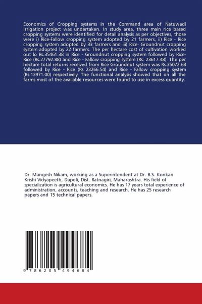 Economics of Cropping systems in the Command area of Natuwadi Irrigation project was undertaken. In study area, three main rice based cropping systems were identified for detail analysis as per objectives, those were i) Rice-Fallow cropping system adopted by 21 farmers, ii) Rice - Rice cropping system adopted by 33 farmers and iii) Rice- Groundnut cropping system adopted by 22 farmers. The per hectare cost of cultivation worked out lo Rs.35461.38 in Rice - Groundnut cropping system followed by Rice-Rice (Rs.27792.88) and Rice - Fallow cropping system (Rs. 23617.48). The per hectare total returns received from Rice Groundnut system was Rs.35072.68 followed by Rice - Rice (Rs 23266.54) and Rice - Fallow cropping system (Rs.13971.00) respectively. The functional analysis showed that on all the farms most of the available resources were found to use in excess quantity.