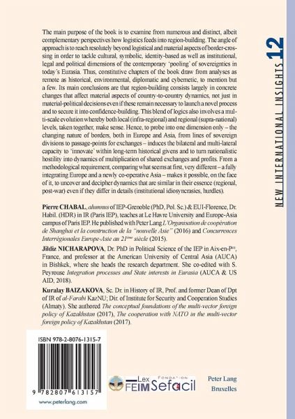 The main purpose of the book is to examine from numerous and distinct, albeit complementary perspectives how logistics feeds into region-building. The angle of approach is to reach resolutely beyond logistical and material aspects of border-crossing in order to tackle cultural, symbolic, identity-based as well as institutional, legal and political dimensions of the contemporary 'pooling' of sovereignties in today's Eurasia. Thus, constitutive chapters of the book draw from analyses as remote as historical, environmental, diplomatic and cybernetic, to mention but a few. Its main conclusions are that region-building consists largely in concrete changes that affect material aspects of country-to-country dynamics, not just in material-political decisions even if these remain necessary to launch a novel process and to secure it into confidence-building. This blend of logics also involves a multi-scale evolution whereby both local (infra-regional) and regional (supra-national) levels, taken together, make sense. Hence, to probe into one dimension only - the changing nature of borders, both in Europe and Asia, from lines of sovereign divisions to passage-points for exchanges -, induces the bilateral and multi-lateral capacity to 'innovate' within long-term historical givens and to turn nationalistic hostility into dynamics of multiplication of shared exchanges and profits. From a methodological requirement, comparing what seems at first, very different - a fully integrating Europe and a newly co-operative Asia - makes it possible, on the face of it, to uncover and decipher dynamics that are similar in their essence (regional, post-war) even if they differ in details (institutional idiosyncrasies, hurdles).