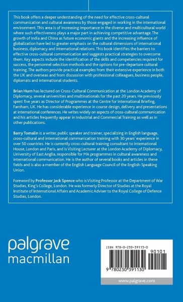 Brian Hurn has been a writer and lecturer on Cross-Cultural Awareness and Communication at universities and multinationals for the past twenty years. He previously spent five years as Director of the Programmes Centre for International Briefings, Farnham, UK. He also has wide experience in course design, delivery, and presentation at conferences in the UK and overseas. His articles frequently appear in Industrial and Commercial Training amongst other publications. Barry Tomalin is a writer, public speaker and trainer specialising in English language, cross-cultural and international communication training, with 30 years experience in over 50 countries. He is also the author of several books and articles in these fields and a member of the English language Council of the English Speaking Union.