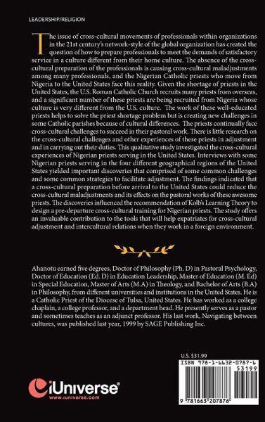 The issue of cross-cultural movements of professionals within organizations in the 21st century's network-style of the global organization has created the question of how to prepare professionals to meet the demands of satisfactory service in a culture different from their home culture. The absence of the cross-cultural preparation of the professionals is causing cross-cultural maladjustments among many professionals, and the Nigerian Catholic priests who move from Nigeria to the United States face this reality. Given the shortage of priests in the United States, the U.S. Roman Catholic Church recruits many priests from overseas, and a significant number of these priests are being recruited from Nigeria whose culture is very different from the U.S. culture. The work of these well-educated priests helps to solve the priest shortage problem but is creating new challenges in some Catholic parishes because of cultural differences. The priests continually face cross-cultural challenges to succeed in their pastoral work. There is little research on the cross-cultural challenges and other experiences of these priests in adjustment and in carrying out their duties. This qualitative study investigated the cross-cultural experiences of Nigerian priests serving in the United States. Interviews with some Nigerian priests serving in the four different geographical regions of the United States yielded important discoveries that comprised of some common challenges and some common strategies to facilitate adjustment. The findings indicated that a cross-cultural preparation before arrival to the United States could reduce the cross-cultural maladjustments and its effects on the pastoral works of these awesome priests. The discoveries influenced the recommendation of Kolb's Learning Theory to design a pre-departure cross-cultural training for Nigerian priests. The study offers an invaluable contribution to the tools that will help expatriates for cross-cultural adjustment and intercultural relations when they work in a foreign environment.