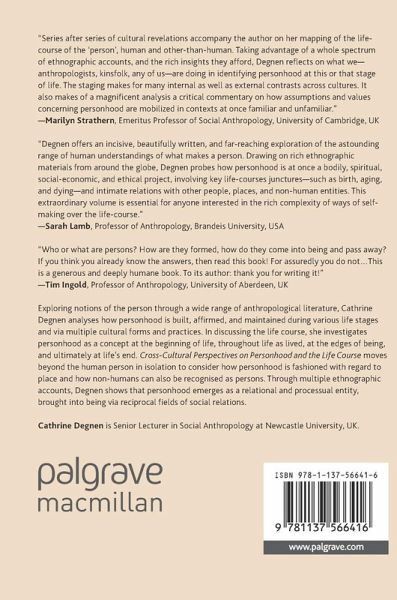 Exploring notions of the person through a wide range of anthropological literature, Cathrine Degnen analyses how personhood is built, affirmed, and maintained during various life stages and via multiple cultural forms and practices. In discussing the life course, she investigates personhood as a concept at the beginning of life, throughout life as lived, at the edges of being, and ultimately at life's end. Cross-Cultural Perspectives on Personhood and the Life Course moves beyond the human person in isolation to consider how personhood is fashioned with regard to place and how non-humans can also be recognised as persons. Through multiple ethnographic accounts, Degnen shows that personhood emerges as a relational and processual entity, brought into being via reciprocal fields of social relations.