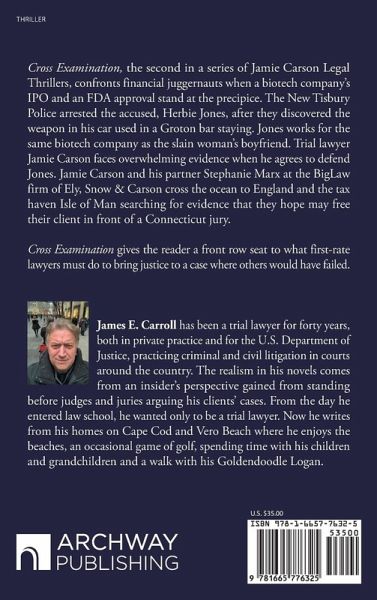 Cross Examination, the second in a series of Jamie Carson Legal Thrillers, confronts financial juggernauts when a biotech company's IPO and an FDA approval stand at the precipice. The New Tisbury Police arrested the accused, Herbie Jones, after they discovered the weapon in his car used in a Groton bar staying. Jones works for the same biotech company as the slain woman's boyfriend. Trial lawyer Jamie Carson faces overwhelming evidence when he agrees to defend Jones. Jamie Carson and his partner Stephanie Marx at the BigLaw firm of Ely, Snow & Carson cross the ocean to England and the tax haven Isle of Man searching for evidence that they hope may free their client in front of a Connecticut jury. Cross Examination gives the reader a front row seat to what first-rate lawyers must do to bring justice to a case where others would have failed. What Others Are Saying About The Jamie Carson Legal Thrillers "Mitch McDeere, Mickey Haller, Frank Galvin, Jake Brigance; all great characters in the legal thriller genre. Well, you can now add Jamie Carson to that lofty list. In his debut novel, Reasonably Foreseeable, attorney turned author James E. Carroll creates a complex story where the lead character must navigate a volatile legal landscape where the most vulnerable are often chewed up and spit out unless they have a champion willing to risk their career, and even their lives to achieve justice. James E. Carroll has written a taut, propulsive drama that will keep you guessing to the very last page." -Casey Sherman, N.Y. Times Bestselling Author of Helltown and A Murder in Hollywood "Connecticut is called 'the land of steady habits.' Not so in the Jamie Carson series. James E. Carroll is a master of narrative who allows the reader to slip into the mind of a brilliant trial lawyer. Like the great writers of legal fiction, Carroll has created a place and an intriguing character who I hope will treat us to courtroom drama in the years to come." -CT Attorney Steven G. Mednick "Cross-Examination, Attorney James E. Carroll's second in a series of Jamie Carson litigation thrillers kept my attention from beginning to end. Carroll's debut thriller, Reasonably Foreseeable, is just as engrossing. Great news. That there is in fact a second and that it is as good or better than the first is rarely the case in the publishing world. Each narrative is fleshed out in fascinating detail, from what the characters are wearing and eating, to the places they are frequenting, both here and abroad. The experienced trial lawyer, whether in the criminal or civil space, will find that Carson's multi-dimensional litigation strategies and tactics 'ring true.' The reader who has never set foot in a courtroom will come away not only with having binged on a good yarn, but also with some serious, albeit vicarious, real-world exposure to what goes on under the hood of litigation that is both multi-faceted and high-stakes." -Prof. Charles E. Rounds, Jr., Suffolk Law School