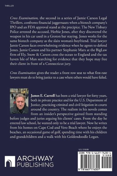 Cross Examination, the second in a series of Jamie Carson Legal Thrillers, confronts financial juggernauts when a biotech company's IPO and an FDA approval stand at the precipice. The New Tisbury Police arrested the accused, Herbie Jones, after they discovered the weapon in his car used in a Groton bar staying. Jones works for the same biotech company as the slain woman's boyfriend. Trial lawyer Jamie Carson faces overwhelming evidence when he agrees to defend Jones. Jamie Carson and his partner Stephanie Marx at the BigLaw firm of Ely, Snow & Carson cross the ocean to England and the tax haven Isle of Man searching for evidence that they hope may free their client in front of a Connecticut jury. Cross Examination gives the reader a front row seat to what first-rate lawyers must do to bring justice to a case where others would have failed. What Others Are Saying About The Jamie Carson Legal Thrillers "Mitch McDeere, Mickey Haller, Frank Galvin, Jake Brigance; all great characters in the legal thriller genre. Well, you can now add Jamie Carson to that lofty list. In his debut novel, Reasonably Foreseeable, attorney turned author James E. Carroll creates a complex story where the lead character must navigate a volatile legal landscape where the most vulnerable are often chewed up and spit out unless they have a champion willing to risk their career, and even their lives to achieve justice. James E. Carroll has written a taut, propulsive drama that will keep you guessing to the very last page." -Casey Sherman, N.Y. Times Bestselling Author of Helltown and A Murder in Hollywood "Connecticut is called 'the land of steady habits.' Not so in the Jamie Carson series. James E. Carroll is a master of narrative who allows the reader to slip into the mind of a brilliant trial lawyer. Like the great writers of legal fiction, Carroll has created a place and an intriguing character who I hope will treat us to courtroom drama in the years to come." -CT Attorney Steven G. Mednick "Cross-Examination, Attorney James E. Carroll's second in a series of Jamie Carson litigation thrillers kept my attention from beginning to end. Carroll's debut thriller, Reasonably Foreseeable, is just as engrossing. Great news. That there is in fact a second and that it is as good or better than the first is rarely the case in the publishing world. Each narrative is fleshed out in fascinating detail, from what the characters are wearing and eating, to the places they are frequenting, both here and abroad. The experienced trial lawyer, whether in the criminal or civil space, will find that Carson's multi-dimensional litigation strategies and tactics 'ring true.' The reader who has never set foot in a courtroom will come away not only with having binged on a good yarn, but also with some serious, albeit vicarious, real-world exposure to what goes on under the hood of litigation that is both multi-faceted and high-stakes." -Prof. Charles E. Rounds, Jr., Suffolk Law School