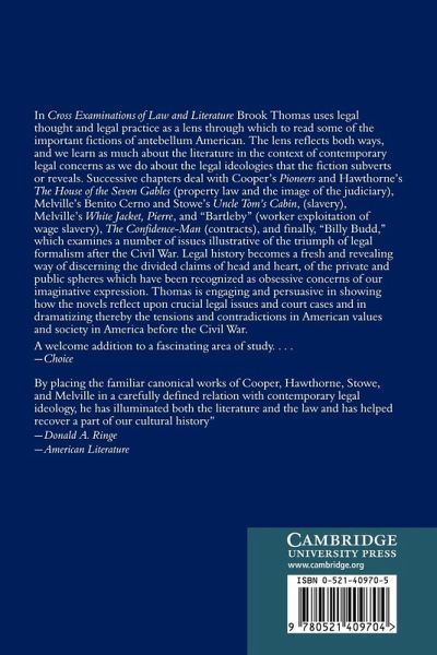 In Cross Examinations of Law and Literature Brook Thomas uses legal thought and legal practice as a lens through which to read some of the important fictions of antebellum America. The lens reflects both ways, and we learn as much about the literature in the context of contemporary legal concerns as we do about the legal ideologies that the fiction subverts or reveals. Successive chapters deal with Cooper's Pioneers and Hawthorne's The House of Seven Gables (property law and the image of the judiciary), Melville's "Benito Cereno" and Stowe's Uncle Tom's Cabin (slavery), Melville's White Jacket, Pierre and "Bartleby" (worker exploitation or wage slavery), The Confidence-Man (contracts), and finally, "Billy Budd," which examines a number of issues illustrative of the triumph of legal formalism after the Civil War.