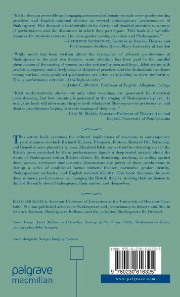 "Klett offers an accessible and engaging assessment of female-to-male cross-gender casting practices and English national identity in several contemporary performances of Shakespeare. Her discussion is admirable in its clarity and detailed attention to a range of performances and the discourses in which they participate. This book is a valuable resource for students interested in cross-gender casting practices and Shakespeare." - Catherine Silverstone, Lecturer in Drama, Theatre and Performance Studies, Queen Mary University of London