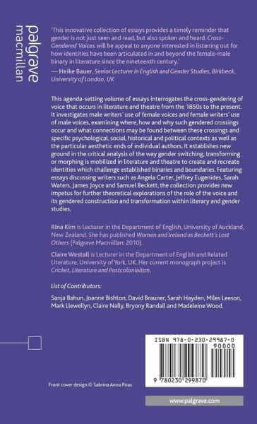 'This innovative collection of essays provides a timely reminder that gender is not just seen and read, but also spoken and heard. Cross-Gendered Voices will be appeal to anyone interested in listening out for how identities have been articulated in and beyond the female-male binary in literature since the nineteenth-century.' - Dr Heike Bauer, Senior Lecturer in English and Gender Studies, Birkbeck, University of London
