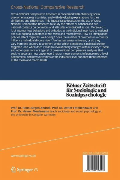 Cross-National Comparative Research is concerned with observing social phenomena across countries, and with developing explanations for their similarities and differences. This Special Issue focuses on the use of Cross-National Comparative Research to study the effects of national and sub-national contexts on behaviors and attitudes of individual actors. Moreover, it is of interest how behaviors and attitudes at the individual level lead to national and sub-national outcomes at the meso and macro levels. How do immigration policies affect migrants' well-being? Does the number of divorcees in a country influence individual divorce risks? Are human values universal, or do they vary from one country to another? Under which conditions is political protest triggered, and when does it lead to revolutionary changes within society? These and other questions are typical of cross-national comparative analyses that seek to ascertain how upper-level (macro, meso) contexts influence micro-levelphenomena, and how outcomes at the individual level are once more reflected at the meso and macro levels.