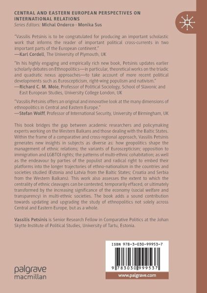 This book bridges the gap between academic researchers and policymaking experts working on the Western Balkans and those dealing with the Baltic States. Within the frame of a comparative and cross-regional approach, Vassilis Petsinis generates new insights in subjects as diverse as: how geopolitics shape the management of ethnic relations; the variants of Euroscepticism; opposition to immigration and LGBTQI rights; the patterns of multi-ethnic cohabitation; as well as the endeavour by parties of the populist and radical right to embed their platforms into the longer trajectories of ethno-nationalism in the countries and societies studied (Estonia and Latvia from the Baltic States; Croatia and Serbia from the Western Balkans). This work also assesses the extent to which the centrality of ethnic cleavages can be contested, temporarily effaced, or ultimately transformed by the increasing significance of the economy (social welfare and transparency) in multi-ethnic societies. Thebook adds a sound contribution towards updating and upgrading the study of ethnopolitics not solely across Central and Eastern Europe, but as a whole.