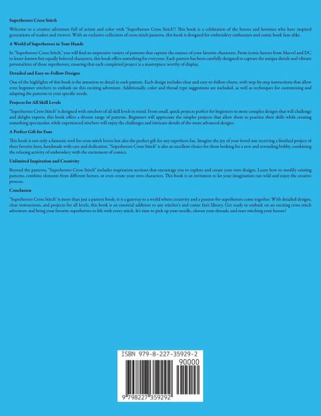 Superheroes Cross Stitch Welcome to a creative adventure full of action and color with "Superheroes Cross Stitch"! This book is a celebration of the heroes and heroines who have inspired generations of readers and viewers. With an exclusive collection of cross stitch patterns, this book is designed for embroidery enthusiasts and comic book fans alike. A World of Superheroes in Your Hands In "Superheroes Cross Stitch," you will find an impressive variety of patterns that capture the essence of your favorite characters. From iconic heroes from Marvel and DC to lesser-known but equally beloved characters, this book offers something for everyone. Each pattern has been carefully designed to capture the unique details and vibrant personalities of these superheroes, ensuring that each completed project is a masterpiece worthy of display. Detailed and Easy-to-Follow Designs One of the highlights of this book is the attention to detail in each pattern. Each design includes clear and easy-to-follow charts, with step-by-step instructions that allow even beginner stitchers to embark on this exciting adventure. Additionally, color and thread type suggestions are included, as well as techniques for customizing and adapting the patterns to your specific needs. Projects for All Skill Levels "Superheroes Cross Stitch" is designed with stitchers of all skill levels in mind. From small, quick projects perfect for beginners to more complex designs that will challenge and delight experts, this book offers a diverse range of patterns. Beginners will appreciate the simpler projects that allow them to practice their skills while creating something spectacular, while experienced stitchers will enjoy the challenges and intricate details of the more advanced designs. A Perfect Gift for Fans This book is not only a fantastic tool for cross stitch lovers but also the perfect gift for any superhero fan. Imagine the joy of your loved one receiving a finished project of their favorite hero, handmade with care and dedication. "Superheroes Cross Stitch" is also an excellent choice for those looking for a new and rewarding hobby, combining the relaxing activity of embroidery with the excitement of comics. Unlimited Inspiration and Creativity Beyond the patterns, "Superheroes Cross Stitch" includes inspiration sections that encourage you to explore and create your own designs. Learn how to modify existing patterns, combine elements from different heroes, or even create your own characters. This book is an invitation to let your imagination run wild and enjoy the creative process. Conclusion "Superheroes Cross Stitch" is more than just a pattern book; it is a gateway to a world where creativity and a passion for superheroes come together. With detailed designs, clear instructions, and projects for all levels, this book is an essential addition to any stitcher's and comic fan's library. Get ready to embark on an exciting cross stitch adventure and bring your favorite superheroes to life with every stitch. It's time to pick up your needle, choose your threads, and start stitching your heroes!