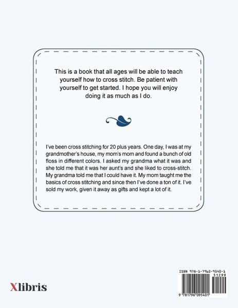 This is a book that all ages will be able to teach yourself how to cross stitch. Be patient with yourself to get started. I hope you will enjoy doing it as much as I do.