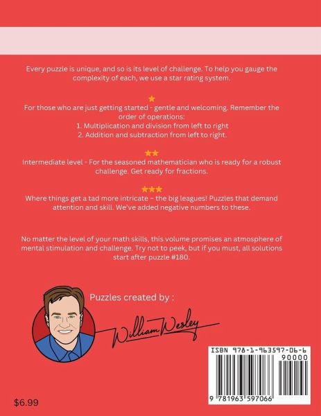Every puzzle is unique, and so is its level of challenge. To help you gauge the complexity of each, we use a star rating system. ¿ For those who are just getting started - gentle and welcoming. Remember the order of operations: 1. Multiplication and division from left to right 2. Addition and subtraction from left to right. ¿¿ Intermediate level - For the seasoned mathematician who is ready for a robust challenge. Get ready for fractions. ¿ ¿¿¿ Where things get a tad more intricate - the big leagues! Puzzles that demand attention and skill. We've added negative numbers to these. No matter the level of your math skills, this volume promises an atmosphere of mental stimulation and challenge. Try not to peek, but if you must, all solutions start after puzzle #180.