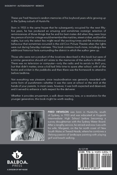 These are Fred Hewison's random memories of his boyhood years while growing up in the Sydney suburb of Hurstville. Born in 1933 in the same house that he subsequently occupied for the next fifty five years, he has produced an amusing and sometimes nostalgic selection of reminiscences of those things that he and his best mates did when they were boys Any person of similar vintage would remember the marbles, street cricket, and bonfire nights, but only the select few might recall the exciting times and the mischievous behaviour that sometimes occurred in the old Civic Picture Theatre when the lights were out during Saturday matinees. This book contains much more, including a few additional historical facts surrounding the district in which the author grew up. Those who were not a product of the locations described in this book but were of a similar generation should still relate to the memories of the author's childhood. There was no television or computer-only the radio and its serials to thrill you, but that didn't matter, since a kid had little time to spare after school, with all the footie and cricket in the paddocks and then there was the homework to attend to before bedtime. Not everything was pleasant, since insubordination was generally rewarded with some form of punishment-whether it was the cane at school or the stick at the hands of your parents. In most cases, however, it was both expected and deserved, and it served to enhance a lad's respect for the deliverer. Whether it provides amusement, a walk down memory lane, or a revelation for the younger generation, this book might be worth reading.