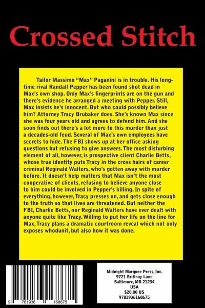 Tailor Massimo "Max" Paganini is in trouble. His long-time rival Randall Pepper has been found shot dead in Max’s own shop. Only Max’s fingerprints are on the gun and there’s evidence he arranged a meeting with Pepper. Still, Max insists he’s innocent. But who could possibly believe him? Attorney Tracy Brubaker does. She’s known Max since she was four years old and agrees to defend him. And she soon finds out there’s a lot more to this murder than just a decades-old feud. Several of Max’s own employees have secrets to hide. The FBI shows up at her office asking questions but refusing to give answers. The most disturbing element of all, however, is prospective client Charlie Betts, whose true identity puts Tracy in the cross hairs of career criminal Reginald Walters, who’s gotten away with murder before. It doesn’t help matters that Max isn’t the most cooperative of clients, refusing to believe anyone close to him could be involved in Pepper’s killing. In spite of everything, however, Tracy presses on, and gets close enough to the truth so that lives are threatened. But neither the FBI, Charlie Betts, nor Reginald Walters have ever dealt with anyone quite like Tracy. Willing to put her life on the line for Max, Tracy plans a dramatic courtroom reveal which not only exposes whodunit, but also how it was done.