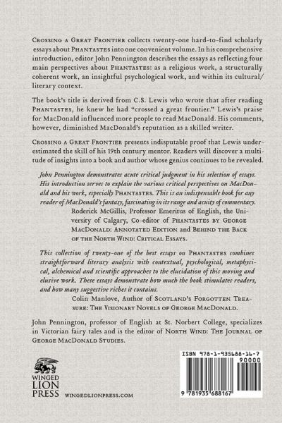 Crossing a Great Frontier collects twenty-one hard-to-find scholarly essays about Phantastes into one convenient volume. In his comprehensive introduction, editor John Pennington describes the essays as reflecting four main perspectives about Phantastes: as a religious work, a structurally coherent work, an insightful psychological work, and within its cultural/literary context. The book's title is derived from C.S. Lewis who wrote that after reading Phantastes, he knew he had "crossed a great frontier. Lewis's praise for MacDonald influenced more people to read MacDonald. His comments, however, diminished MacDonald's reputation as a skilled writer. Crossing a Great Frontier presents indisputable proof that Lewis underestimated the skill of his 19th century mentor. Readers will discover a multitude of insights into a book and author whose genius continues to be revealed. "John Pennington demonstrates acute critical judgment in his selection of essays. His introduction serves to explain the various critical perspectives on MacDonald and his work, especially Phantastes. This is an indispensable book for any reader of MacDonald's fantasy, fascinating in its range and acuity of commentary." Roderick McGillis, Professor Emeritus of English, the University of Calgary, Co-editor of Phantastes by George MacDonald: Annotated Edition and Behind the Back of the North Wind: Critical Essays. "This collection of twenty-one of the best essays on Phantastes combines straightforward literary analysis with contextual, psychological, metaphysical, alchemical and scientific approaches to the elucidation of this moving and elusive work. These essays demonstrate how much the book stimulates readers, and how many suggestive riches it contains." Colin Manlove, Author of Scotland's Forgotten Treasure: The Visionary Novels of George MacDonald. John Pennington, professor of English at St. Norbert College, specializes in Victorian fairy tales and is the editor of North Wind: The Journal of George MacDonald Studies.