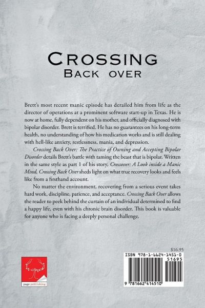 Brett's most recent manic episode has derailed him from life as the director of operations at a prominent software start-up in Texas. He is now at home, fully dependent on his mother, and officially diagnosed with bipolar disorder. Brett is terrified. He has no guarantees on his long-term health, no understanding of how his medication works and is still dealing with hell-like anxiety, restlessness, mania, and depression. Crossing Back Over: The Practice of Owning and Accepting Bipolar Disorder details Brett's battle with taming the beast that is bipolar. Written in the same style as part 1 of his story, Crossover: A Look inside a Manic Mind, Crossing Back Over sheds light on what true recovery looks and feels like from a firsthand account. No matter the environment, recovering from a serious event takes hard work, discipline, patience, and acceptance. Crossing Back Over allows the reader to peek behind the curtain of an individual determined to find a happy life, even with his chronic brain disorder. This book is valuable for anyone who is facing a deeply personal challenge.