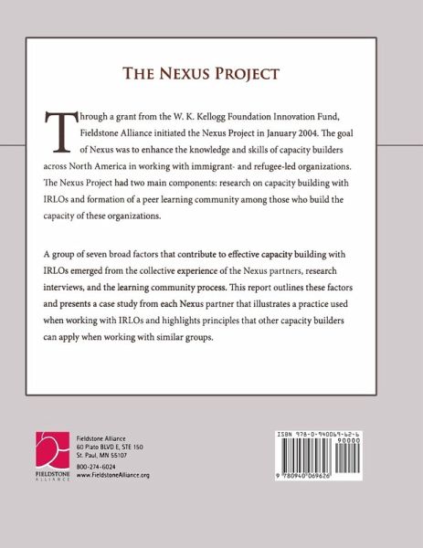 A growing number of nonprofit organizations have been created by immigrants and refugees to serve their communities in North America. These immigrant- and refugee-led organizations (IRLOs) work to provide services and meet a variety of needs, while at the same time building the infrastructure of these communities. Through a grant from the W. K. Kellogg Foundation Innovation Fund, Fieldstone Alliance initiated the two-year project in January 2004. The goal of Nexus was to enhance the knowledge and skills of capacity builders across North America in working with immigrant- and refugee-led organizations. The Nexus Project had two main components: research on capacity building with IRLOs and formation of a peer learning community among those who build the capacity of these organizations. This report draws three broad lessons for the capacity building field, with implications for the funding community, IRLOs, and capacity builders: effective capacity building takes time, which requires resources; more immigrant and refugee capacity builders are needed; and capacity builders need continuous learning and development. The Introduction describes the formation of the Nexus Project, its goals, and its working definitions. Chapter 1 describes the factors that result in effective capacity building with immigrant- and refugee-led organizations. Chapter 2 presents case studies from each of the Nexus partners. Each case study illustrates a practice used by Nexus partners when working with IRLOs. Chapter 3 details lessons Nexus partners learned through the course of this project. It further states implications of these lessons for those who fund work with IRLOs, for IRLO leaders, and for capacity building providers. The Appendices include a summary of IRLO research conducted by Wilder Research Center specifically for Nexus; a bibliography; and descriptions of the organizations and individuals who contributed to this report.