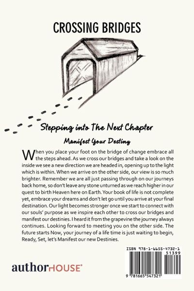 Crossing Bridges Stepping into the Next Chapter Manifest Your Destiny When you place your foot on the bridge of change embrace all the steps ahead as we cross our bridges and take a look on the inside to see a new direction we are headed in, opening up to the light that is within so when we arrive on the other side, our view is so much brighter. Remember we are all just passing through on our journeys back home, so don't leave any stone unturned as we reach higher in our quest to birth Heaven here on Earth. Your book of life is not complete yet, so embrace your dreams and don't let go until you arrive at your final destination. Our light becomes stronger once we start to connect with our soul families and inspire each other to cross our bridges and manifest our destinies. I heard it from the grapevine the journey always continues. Looking forward to meeting you on the other side. The future starts Now, your journey of a life time is just waiting to begin, Ready, Set, let's Manifest our new Destinies.