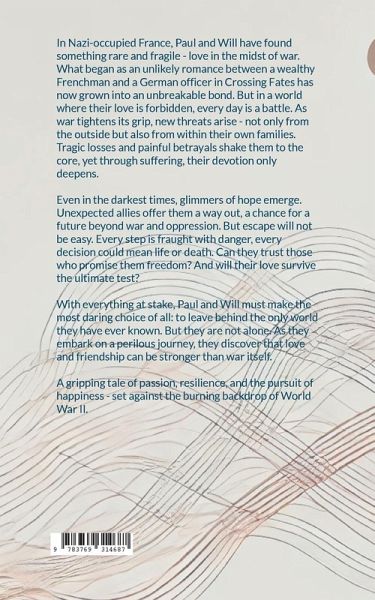 In Nazi-occupied France, Paul and Will have found something rare and fragile - love in the midst of war. What began as an unlikely romance between a wealthy Frenchman and a German officer in Crossing Fates has now grown into an unbreakable bond. But in a world where their love is forbidden, every day is a battle. As war tightens its grip, new threats arise - not only from the outside but also from within their own families. Tragic losses and painful betrayals shake them to the core, yet through suffering, their devotion only deepens. Even in the darkest times, glimmers of hope emerge. Unexpected allies offer them a way out, a chance for a future beyond war and oppression. But escape will not be easy. Every step is fraught with danger, every decision could mean life or death. Can they trust those who promise them freedom? And will their love survive the ultimate test? With everything at stake, Paul and Will must make the most daring choice of all: to leave behind the only world they have ever known. But they are not alone. As they embark on a perilous journey, they discover that love and friendship can be stronger than war itself. A gripping tale of passion, resilience, and the pursuit of happiness - set against the burning backdrop of World War II. Im von den Nazis besetzten Frankreich haben Paul und Will etwas Seltenes gefunden - Liebe inmitten des Krieges. Was in Crossing Fates als unerwartete Romanze zwischen einem wohlhabenden Franzosen und einem deutschen Offizier begann, ist zu einer tiefen Verbindung geworden. Doch in einer Welt, in der ihre Liebe verboten ist, wird jeder Tag zum Kampf. Tragische Verluste und schmerzhafte Erfahrungen erschüttern sie, doch ihre Liebe wird dadurch nur stärker. Selbst in den dunkelsten Zeiten eröffnen sich neue Wege. Unerwartet bietet sich die Chance auf eine Zukunft jenseits von Krieg und Unterdrückung. Wird ihre Liebe diese Prüfung überstehen? Paul und Will treffen die mutigste Entscheidung ihres Lebens: Sie verlassen Europa und beginnen ein neues Leben. Doch sie sind nicht allein. Auf ihrem unberechenbaren Weg erkennen sie, dass Freundschaft und Liebe stärker sein können als der Krieg selbst. Eine fesselnde Geschichte über Leidenschaft, Widerstandskraft und den Mut, für das eigene Glück zu kämpfen - vor der brennenden Kulisse des Zweiten Weltkriegs.