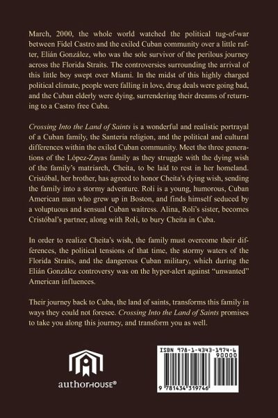 March, 2000, the whole world watched the political tug-of-war between Fidel Castro and the exiled Cuban community over a little rafter, Elian Gonzalez, who was the sole survivor of the perilous journey across the Florida Straits. The controversies surrounding the arrival of this little boy swept over Miami. In the midst of this highly charged political climate, people were falling in love, drug deals were going bad, and the Cuban elderly were dying, surrendering their dreams of returning to a Castro free Cuba. Crossing Into the Land of Saints is a wonderful and realistic portrayal of a Cuban family, the Santeria religion, and the political and cultural differences within the exiled Cuban community. Meet the three generations of the Lopez-Zayas family as they struggle with the dying wish of the family's matriarch, Cheita, to be laid to rest in her homeland. Cristobal, her brother, has agreed to honor Cheita's dying wish, sending the family into a stormy adventure. Roli is a young, humorous, Cuban American man who grew up in Boston, and finds himself seduced by a voluptuous and sensual Cuban waitress. Alina, Roli's sister, becomes Cristobal's partner, along with Roli, to bury Cheita in Cuba. In order to realize Cheita's wish, the family must overcome their differences, the political tensions of that time, the stormy waters of the Florida Straits, and the dangerous Cuban military, which during the Elian Gonzalez controversy was on the hyper-alert against "unwanted" American influences. Their journey back to Cuba, the land of saints, transforms this family in ways they could not foresee. Crossing Into the Land of Saints promises to take you along this journey, and transform you as well.
