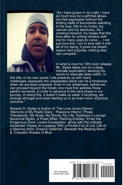 "As I have grown in my craft; I have so much love for a gift that allows me free expression without the limiting walls of boundaries standing in the way; this is my truths, my canvas and my sanctuary. As I continue forward; my hopes that this love affair for writing remains with me for many years to come.... I not just love this, I am in love with it with all of my being; it gives me breath, reason and purpose; nothing else can compare." In what is now his 15th book release; Mr. Styles takes you on a deep, intimate exploration; allowing his words to resonate deep within. In this title, in his own words "Life presents us with many challenges; especially the unexpected which can be a hindrance when we are least prepared. Even in our wilderness, before we can proceed beyond the forest; one must first address those painful moments, in order to advance to the next phase in our journey. In doing this, it doesn't make us weak; if anything, we emerge stronger and wiser leading us to an even more victorious outcome."