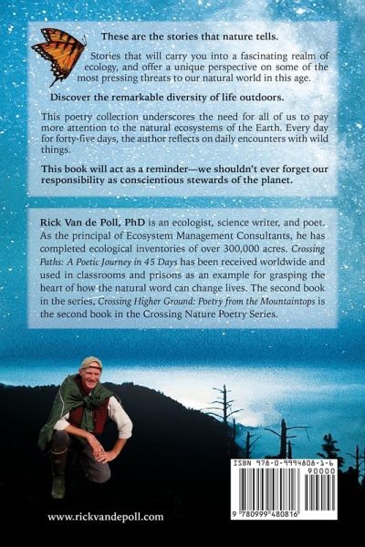 These are the stories that nature tells. Meet the wild things and then listen to their mighty wisdom. This is the first book in the series.Are you ready to experience your dive into the fascinating realm of ecology? Would you like to encounter flirtatious porcupines, elusive mountain lions, and inquiring bears? Rick Van de Poll is an accomplished ecologist, science writer, and poet who has experienced the nature world from a life transforming place.Rick Van de Poll who has devoted his entire life to the service of the natural world invites you to experience his daily encounters with the wild things through his nature poetry. This poetry collection underscores the need for all of us to pay more attention to the natural ecosystems of the Earth. Every day for forty-five days, the author reflects on daily encounters with wild things.Crossing Paths: A Poetic Journey in 45 Days is a sensitive and beautiful illustrated nature poetry book journaling the author's experiences where he wrote one poem every day for 45 days.In Crossing Paths you'll experience:The remarkable diversity of life outdoors A unique perspective of nature poetry Develop a deep desire to go exploring A different understanding of the ecosystem around you And why it is important to make one choice and one decision each day. Crossing Paths: A Poetic Journey in 45 Days will be a reminder that we shouldn't every forget our responsibility as conscientious stewards of the planet. Get Crossing Paths to experience life's journey from the secret places of the natural world.