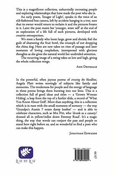 Offering an affectionate and often humorous peek into a child¿s world as she matures, Crossing the Bloodline touches on universal human experiences from sibling rivalry to love; from loss to the wisdom that comes too late, taking us on a journey to the crossing point where childhood and maturity meet face to face. Lucid and tightly honed, this is gracious poetry that will leave images resonating long after reading. This is a magnificent collection, unhurriedly recreating people and exploring relationships that have made the poet who she is. Ann Drysdale In the powerful, often joyous poems of Crossing the Bloodline, Angela Platt writes movingly of subjects like family and memories ¿ It¿s a magic thing, the way that words can conjure the past and people to stand here right before us, and so wonderful to find a poet who can make this happen. Jonathan Edwards