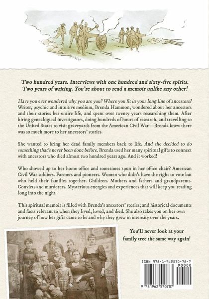 To help fulfill my purpose in this life, I must find out about my past. Two hundred years. Interviews with one hundred and sixty-five spirits. Two years of writing. You are about to read a memoir unlike any other! Have you ever wondered why you are you? Where you fit in you long line of ancestors? Writer, psychic and intuitive medium, Brenda Hammon, wondered about her ancestors and their stories her entire life, and spent over twenty years researching them. After hiring genealogical investigators, doing hundreds of hours of research, and travelling to the United States to visit graveyards from the American Civil War - Brenda knew there was so much more to her ancestors' stories. She wanted to bring her dead family members back to life. And she decided to do something that's never been done before. Brenda used her many spiritual gifts to connect with ancestors who died almost two hundred years ago. And it worked! Who showed up in her home office and sometimes spun in her office chair? American Civil War soldiers. Farmers and pioneers. Women who didn't have the right to vote but who held their families together. Children. Mothers and fathers and grandparents. Convicts and murderers. Mysterious energies and experiences that will keep you reading long into the night. This spiritual memoir is filled with Brenda's ancestors' stories; and historical documents and facts relevant to when they lived, loved, and died. She also takes you on her own journey of how her gifts came to be and why they grew in intensity over the years. You'll never look at your family tree the same way again!