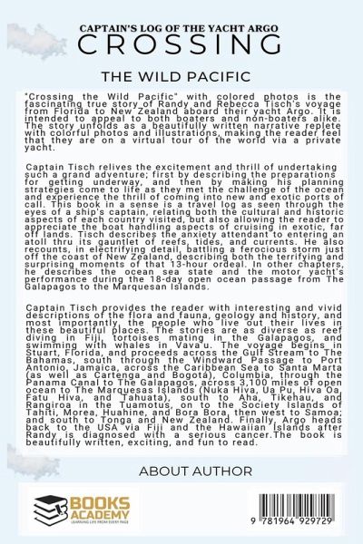 CROSSING THE WILD PACIFIC Is a true adventure story based on the Captain's Log of the Yachi Argo and its passage from Florida to New Zealand. It describes the "how to...", as well as a description of the seas, lands and people encountered during the 10,000 mile voyage to the South Pacific. `About the Author Robert R. (Randy) Tisch and his wife, Rebecca, reside in Ann Arbor, Michigan. They began their boating career on the Great Lakes in 1992 and circumnavigated Lakes Superior, Michigan and Huron. After leaving their professions in 2009, they purchased their first trans-ocean cruiser, and have since traveled over 50,000 ocean miles from Alaska to Newfoundland, and from Newfoundland to New Zealand. Randy holds a USCG Captain's license. During his professional life, Randy built a successful investment management practice and ultimately sold it to a public company prior to beginning his ocean cruising experiences. Rebecca is a pediatric ophthalmologist.